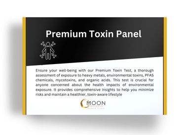The Premium Toxin Test assesses exposure to heavy metals, environmental toxins, PFAS chemicals, mycotoxins, and organic acids.